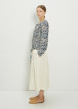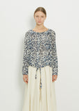 Sara Lanzi printed blue bomber with ruched seaming throughout and wide neck in cotton silk. Features thin self drawcords at neck and hem, cinched cuffs, and concealed button front closure. Relaxed fit.