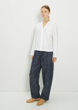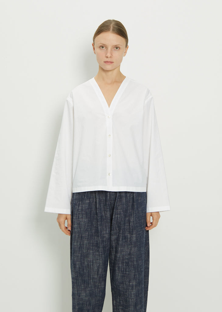 Sara Lanzi optical white v-neck shirt in crisp cotton poplin. Features a clean placket, button front closure, and a straight hem. Boxy fit.