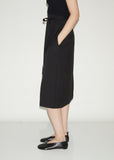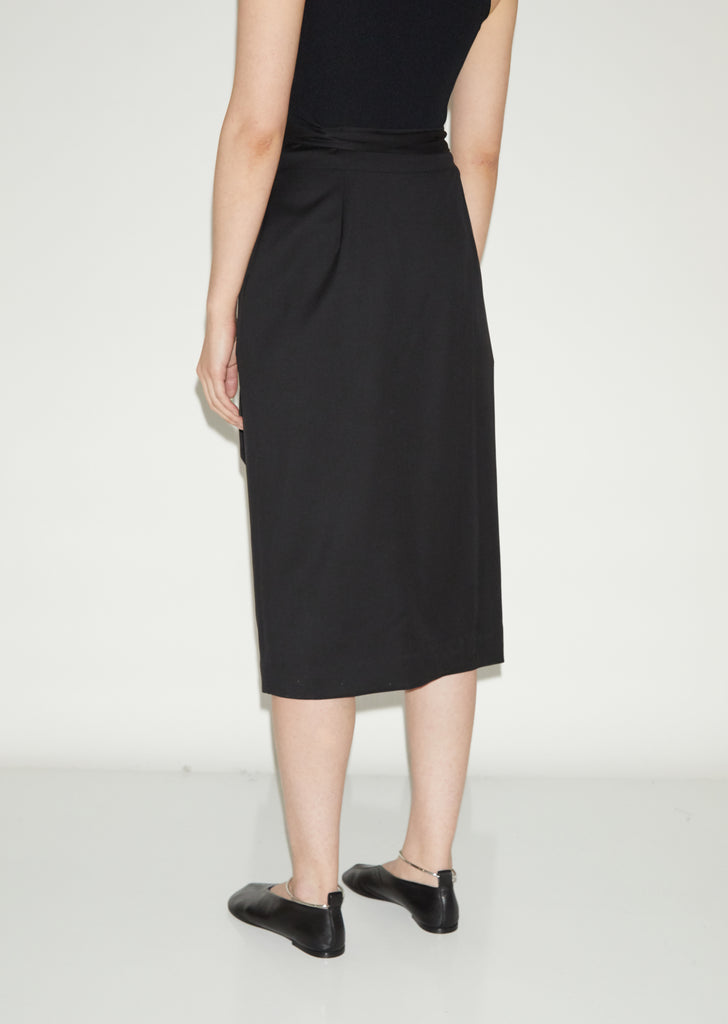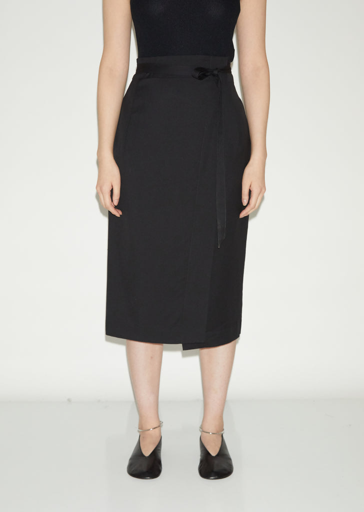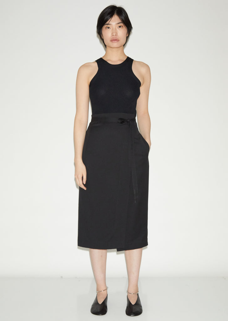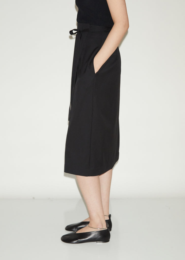 Mid-length wrap skirt in black worsted wool, finished with two integrated self-tie straps at the waist. High, wide set-on waistband. Waistline darts. On-seam side pockets. Straight, over-the-knee hem. A-line silhouette. Classic fit.