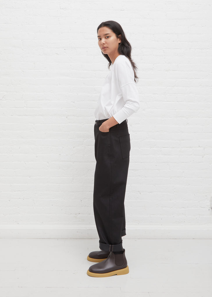 Studio Nicholson signature Ruthe jeans in black. One of our favorites — crafted in rigid cotton denim that will break-in and soften with wear, these jeans have the perfect relaxed, slouchy fit with a high-waist and curved wide leg shape. Features 5-Pocket styling and finished with silver-tone button and zipper fly.