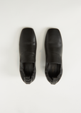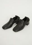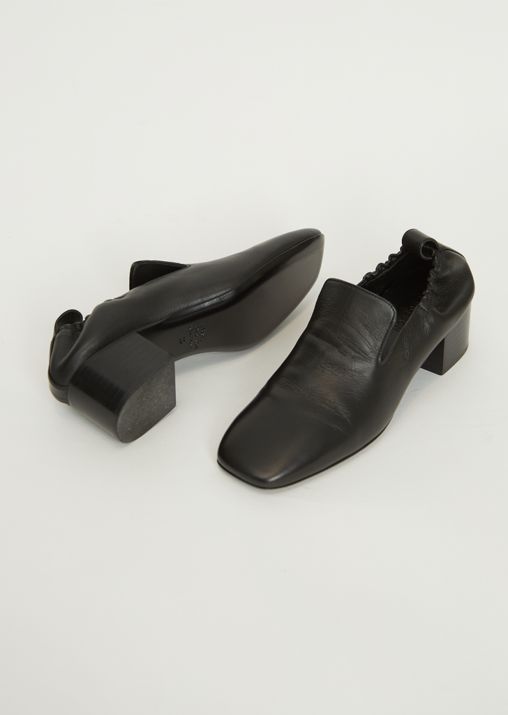 Studio Nicholson black heeled loafer in leather. Features a square toe, high vamp with notches, and gathered heel. Set on a block heel.