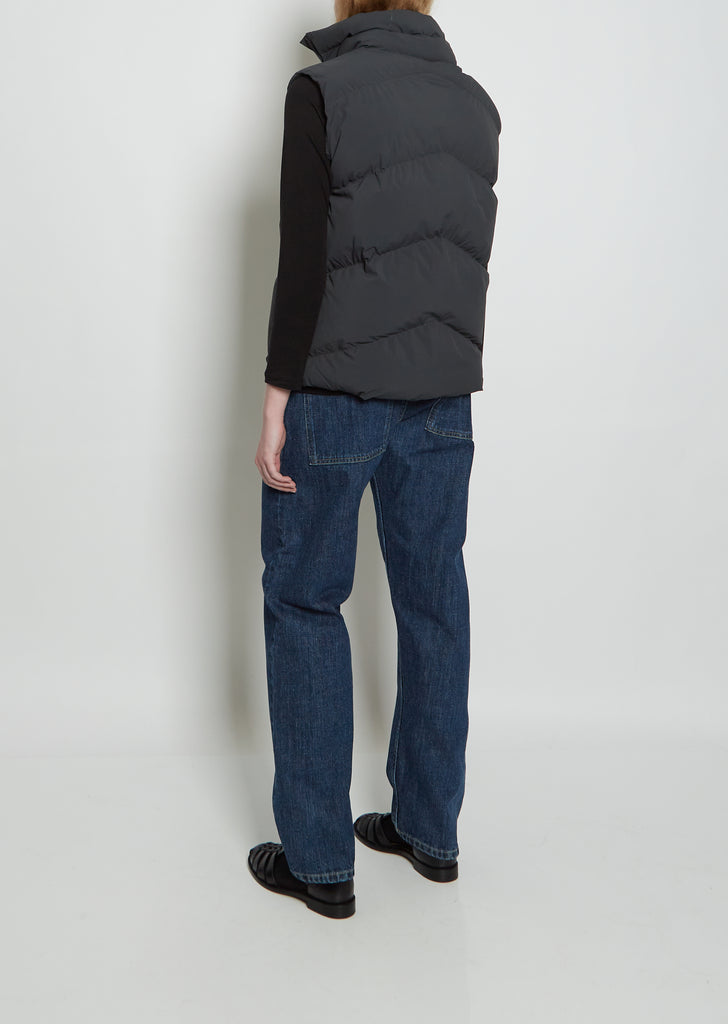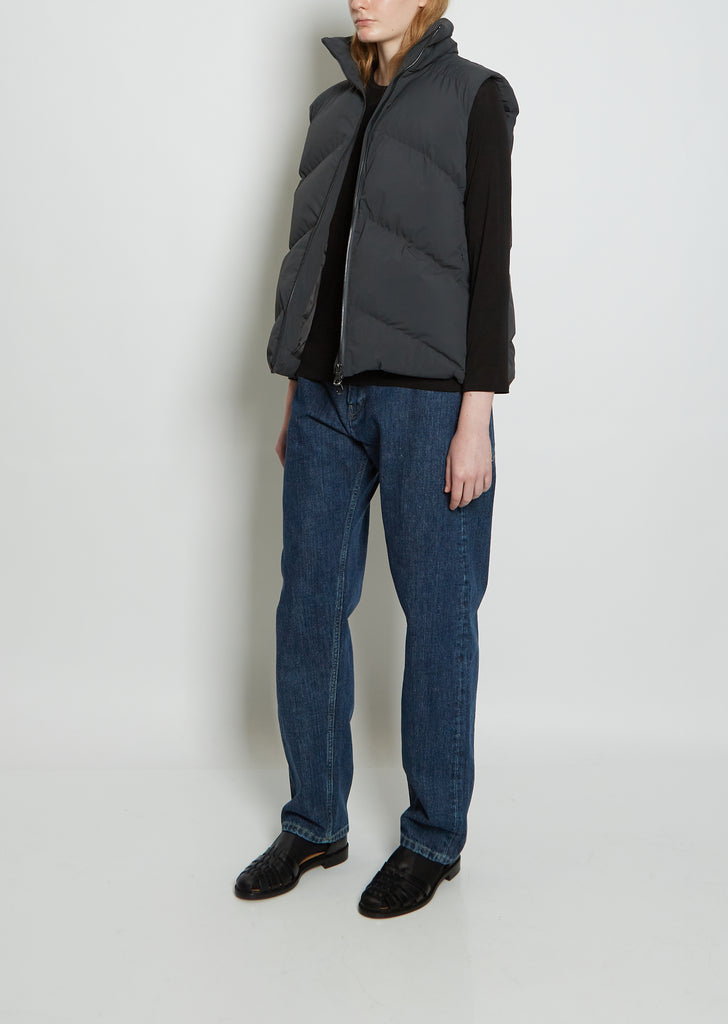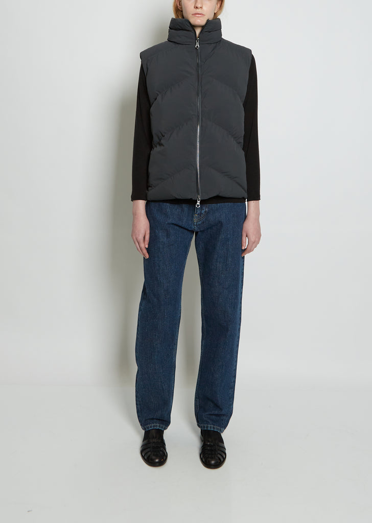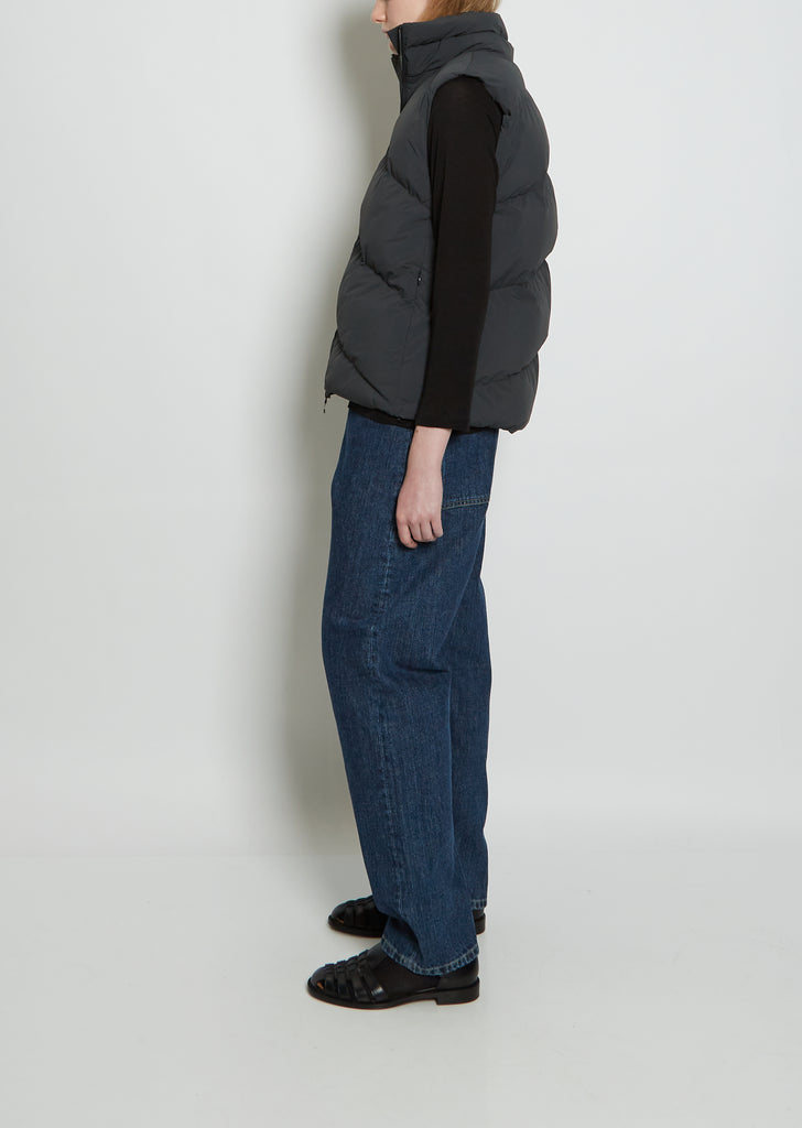 Studio Nicholson flint grey padded puffer vest with a tall collar and center front zipper in a recycled polyester eco-down.