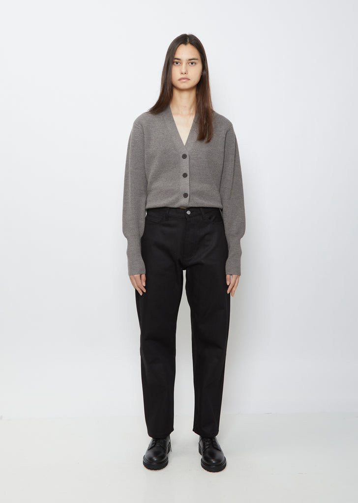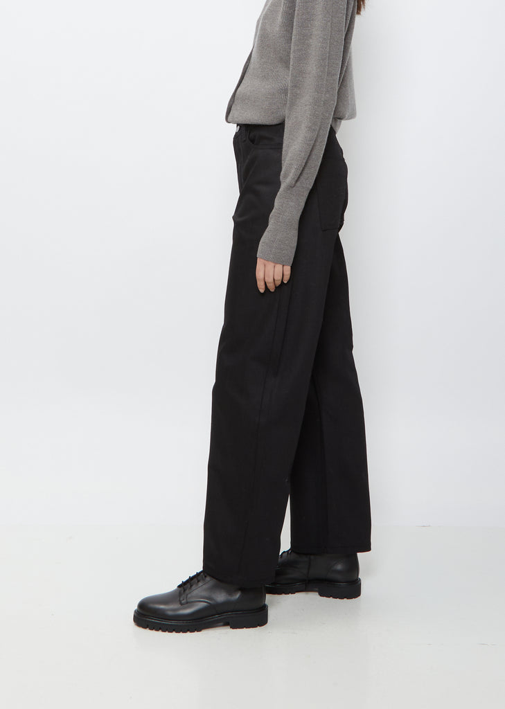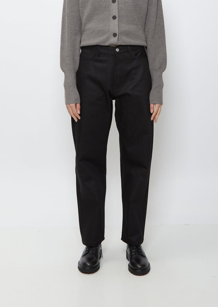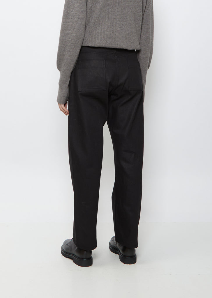 Studio Nicholson signature Ruthe jeans in black. Crafted in rigid cotton denim that will break-in and soften with wear, these jeans have the perfect relaxed, slouchy fit with a high-waist and curved wide leg shape. Features 5-Pocket styling and finished with silver-tone button and zipper fly.