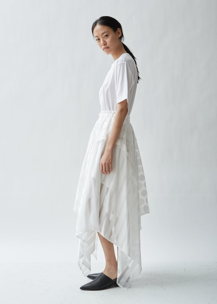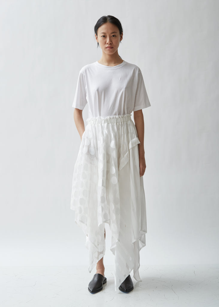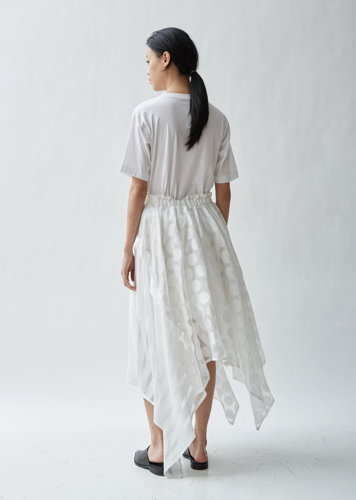 White handkerchief skirt combining satin polka dot and striped pieces. Asymmetrical a-line silhouette with a gathered elasticized waistband. Signature raw edge detailing throughout. Short white lining. Color: White. 55% Rayon, 45% Polyester. Made in Japan.