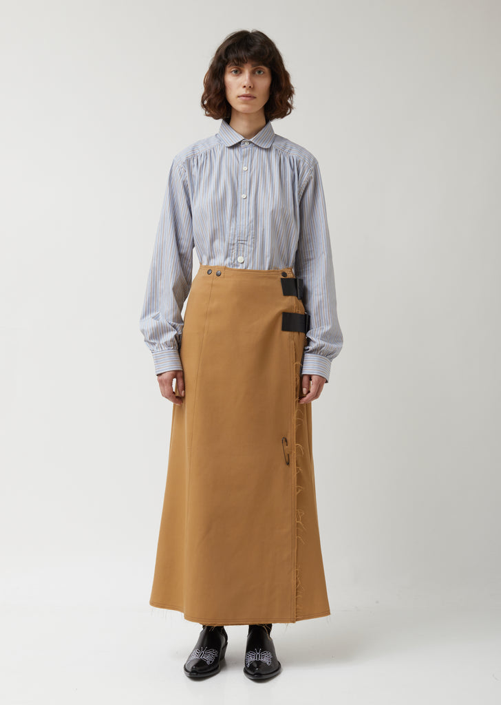 Gored wrap skirt crafted from camel-colored worsted wool twill, featuring twin cowhide pin-buckle straps at the left side and a safety-pin embellishment at the front. Mid-rise. Grown-on waist with snap-button fastening. Concealed snap side closure. Gunmetal-tone hardware. Raw frayed edges. Straight maxi hem. A-line silhouette. Classic fit.