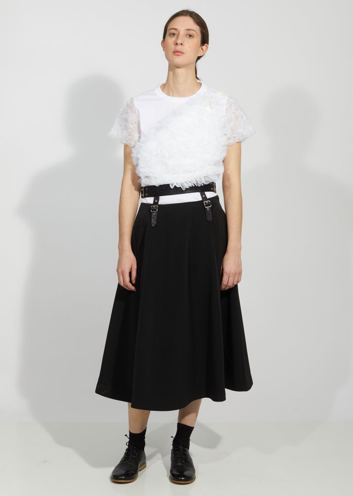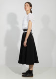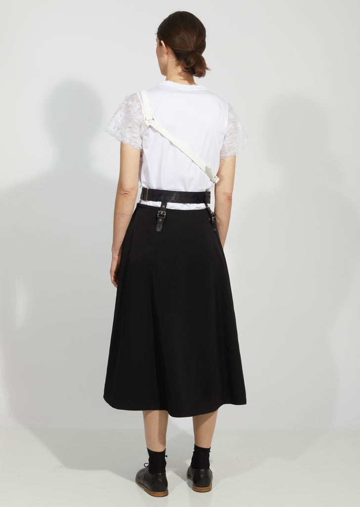 Black mid-rise A-line skirt in faille, finished with a satin-faced-twill pin-buckle belt that hugs the high waist, imparting a “hanging waistband” effect.