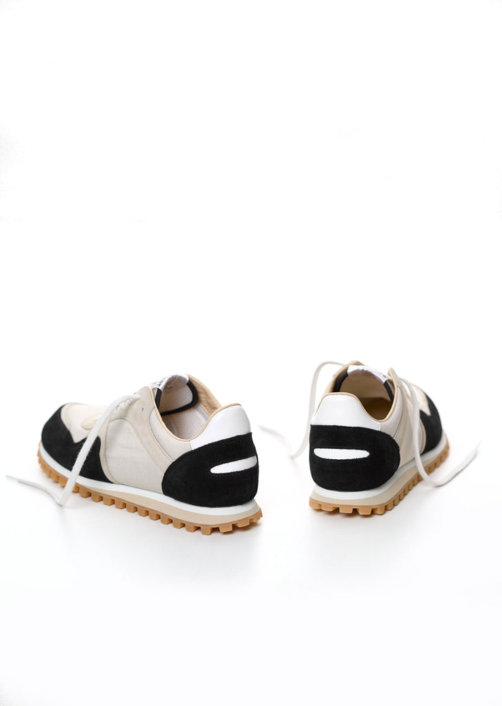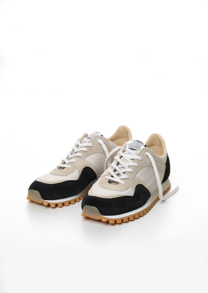 Spalwart Marathon Trail Low in Black. Signature sneaker manufactured in the same plant using the same moulds and machinery since the 1950's, this style is crafted with premium suede and airbag fabric with a rugged rubber outsole. Features a white cap made from natural vegetable tanned leather.