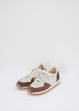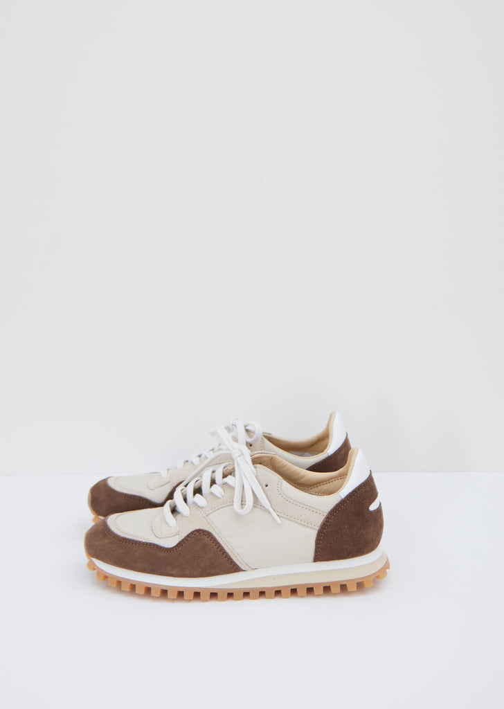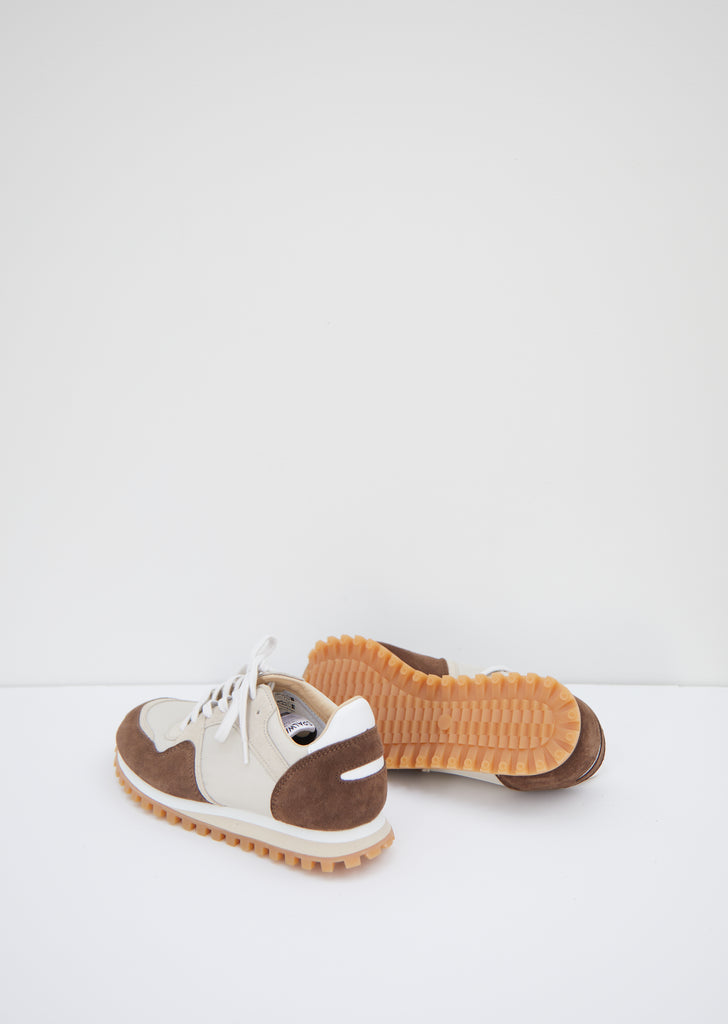 Spalwart Marathon Trail Low in Brown. Signature sneaker manufactured in the same plant using the same moulds and machinery since the 1950's, this style is crafted with brown premium suede and light beige airbag fabric with a rugged rubber outsole. Features a light white leather back cap in leather.