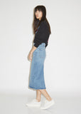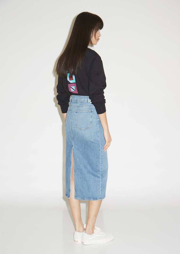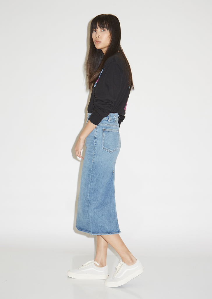 Light wash blue denim skirt styled with high-cut slits in front and back. Drawing from classic 90's styling, this straight-cut skirt is made in the U.S. and features a hint of stretch and flattering high rise waist. Detailed with five pocket styling, silver-tone rivets, and yellow topstitching. Complete with a zipper fly and engraved button closure, and belt loops at the waist. Color: California. 100% Cotton. 98% cotton, 2% elastane. Made in the U.S.