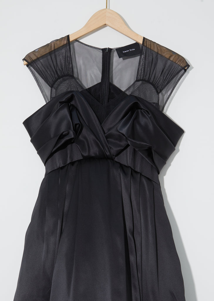 Simone Rocha Silk Satin Wrap Dress in Black. Statement long dress in silk satin and tulle with draped satin bustline and empire full skirt with petticoat underpinning. Features an asymmetrical skirt hem and silk sash that ties at the back waist.