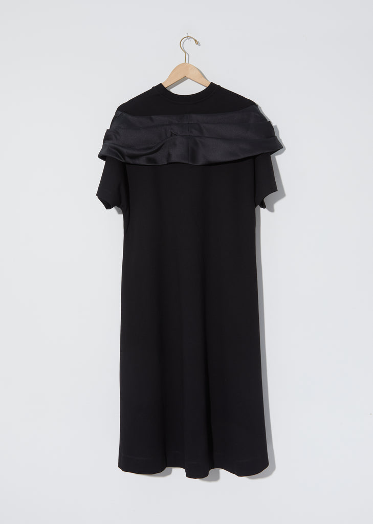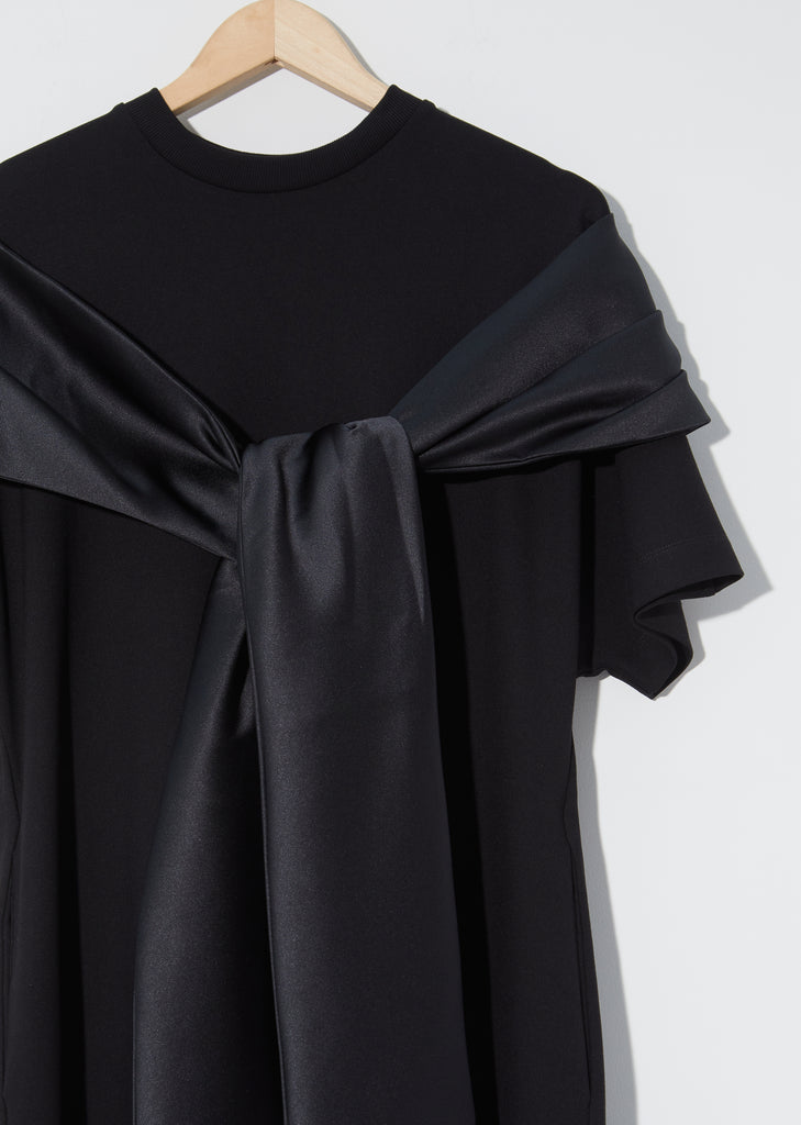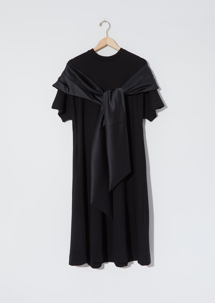 Simone Rocha Wrap A-line Dress in Black. Short dolman-sleeve T-shirt dress in sponge jersey, with dramatic satin ribbon sash that ties at the front