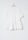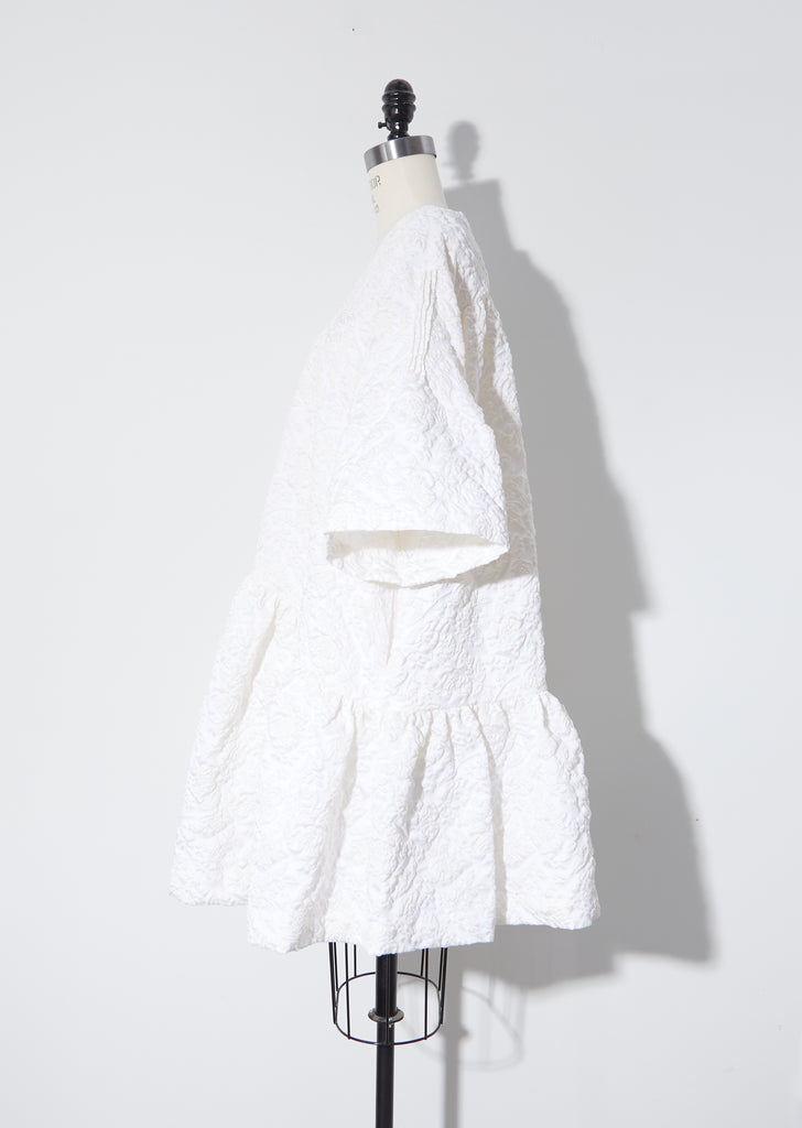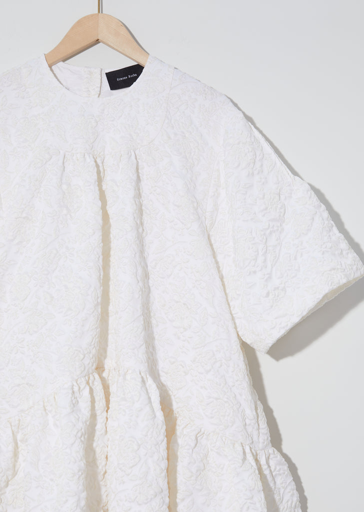 Simone Rocha Short Gathered Dress in Ivory. The label's signature voluminous dress in a shorter length, crafted in cloqué patterned with beautiful florals.