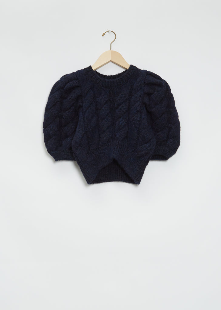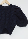 Simone Rocha navy blue cropped puff sleeve sweater in a chunky alpaca and wool blended cable knit.