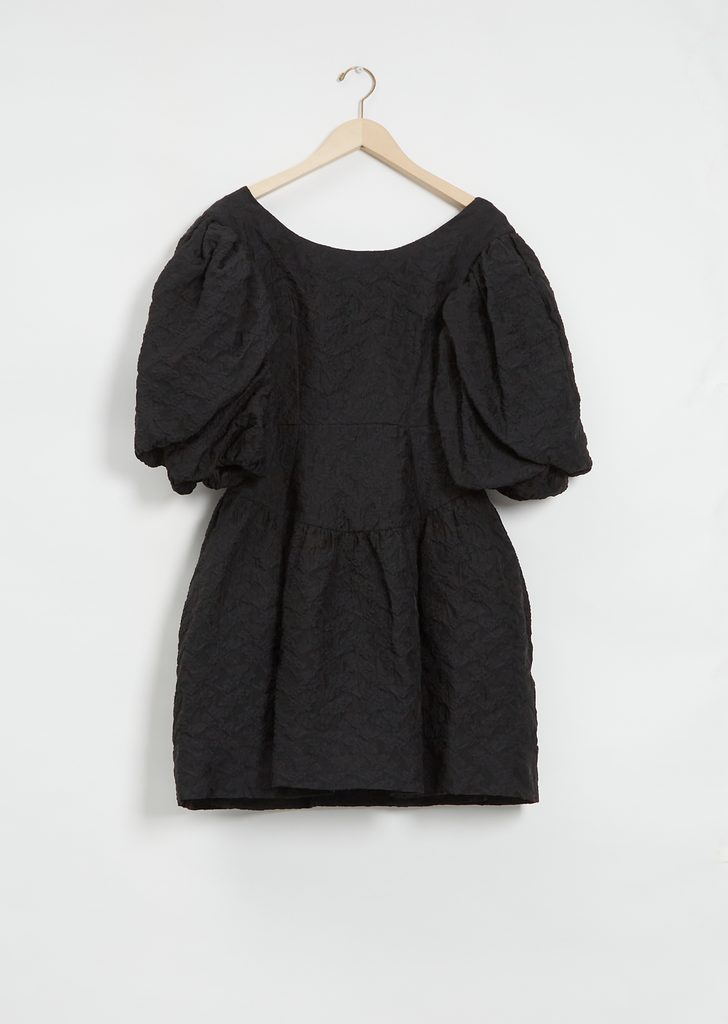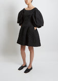 Simone Rocha black layered puff sleeve mini dress with an open neckline in a floral embossed cotton blend. Also available in Blush