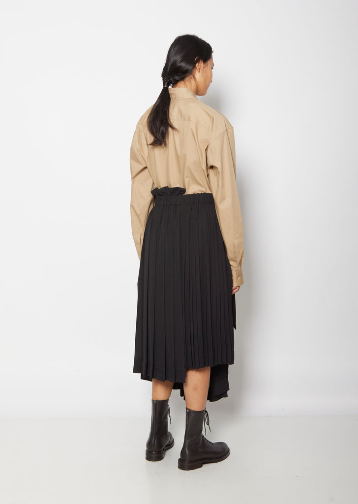 Simone Rocha black fluid pull on pleated skirt with a draped front pleated panel in lightweight polyester. Elasticated waist. Asymmetrical hem. Easy, relaxed fit. Midi-length hem. Unlined.