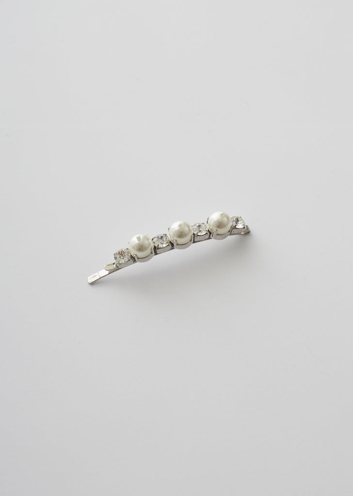 Silver-tone slide hair clip embellished with rounded imitation pearls topped with beads, and diamanté crystals.