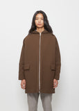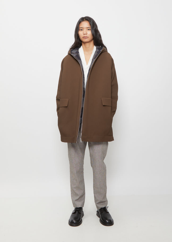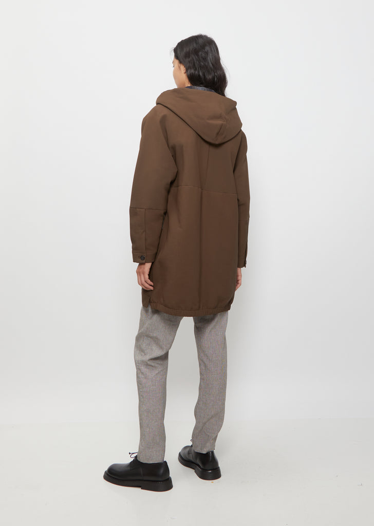 Stephan Schneider tobacco-brown hooded coat with an exposed zipper textured nylon. Hood and front lined in a quilted brushed cotton. Side pockets. Fully lined back and sleeves. Slightly oversized fit.