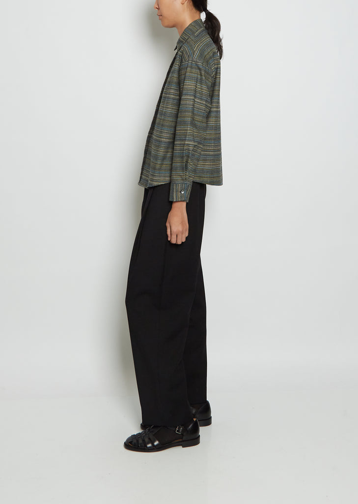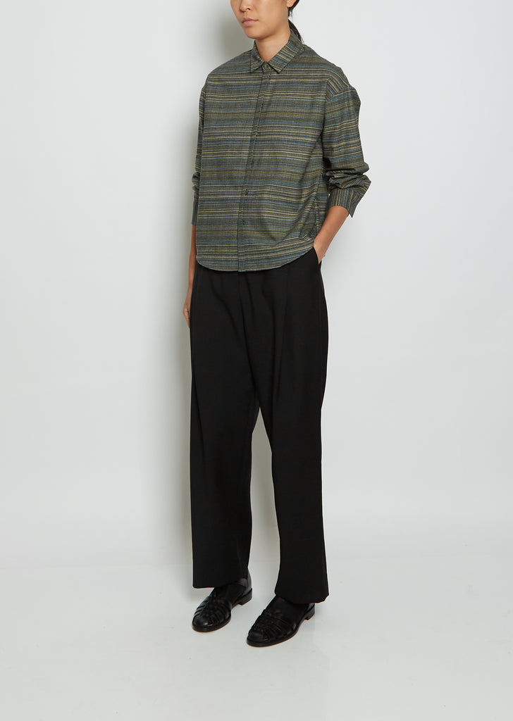 Stephan Schneider blue and beige striped button-down shirt with a pointed collar, dropped shoulder and rounded shirt hem in a brushed cotton.