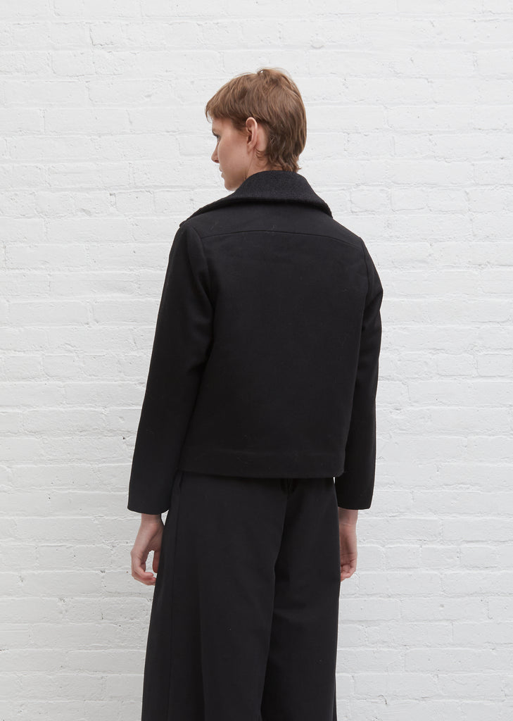 Stephan Schneider black zip-up jacket with a knitted high collar in a think wool blend. Features a padded quilted satin lining, inner pockets and slightly elasticated sleeve cuffs. Straight silhouette with a regular fit.