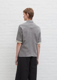 Stephan Schneider grey pinstripe button up collared blouse with signature seamless shoulders in super soft brushed cotton. Sleeves shown rolled up. Finished with tonal grey shell buttons. Relaxed fit.