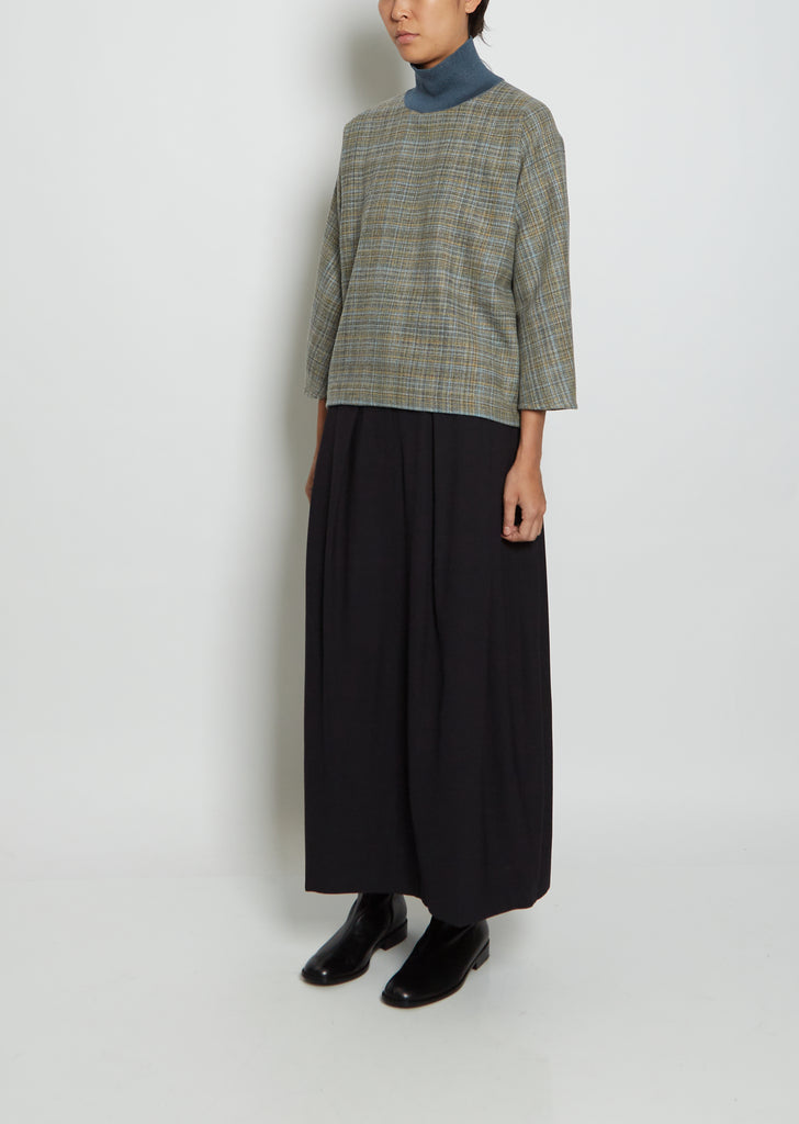 Stephan Schneider arctic blue and gold toned plaid turtleneck top with dolman sleeves and a rib knit collar in woven wool.