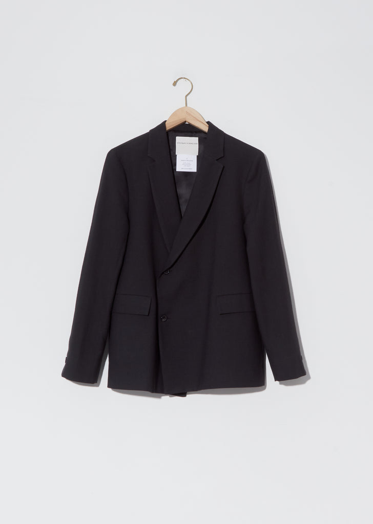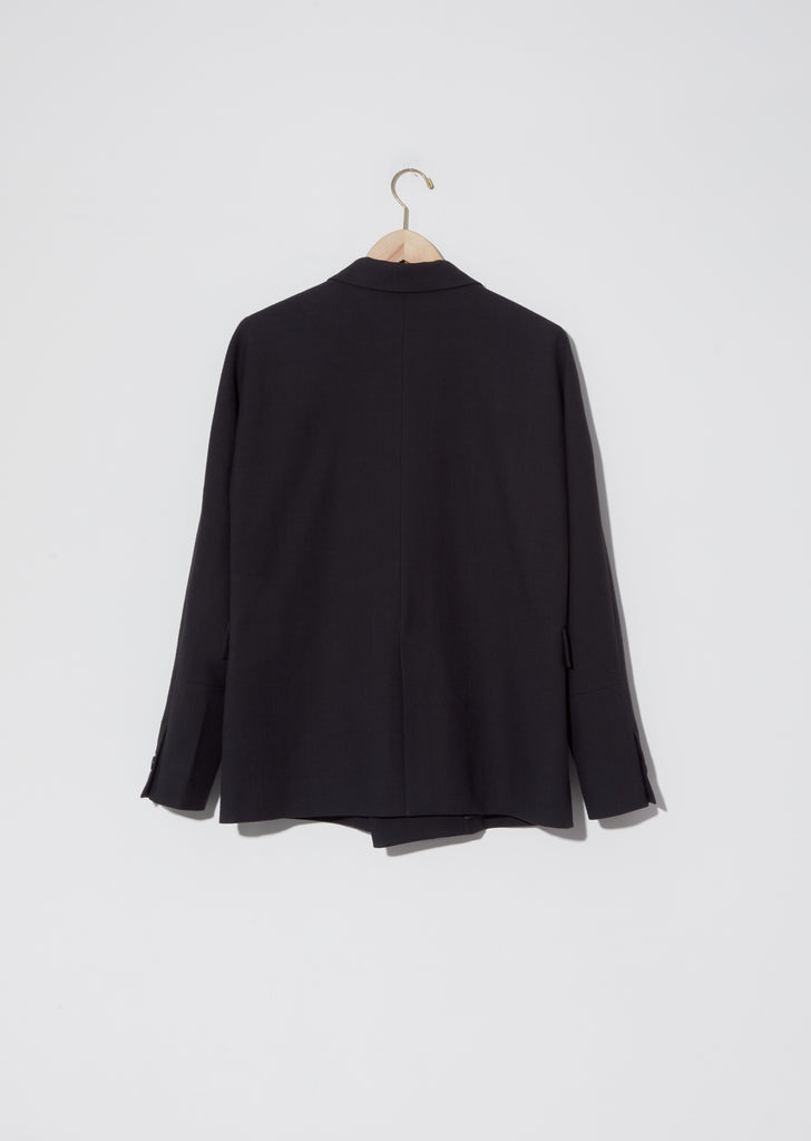 Stephan Schneider clean and minimal onyx-black blazer with wrap front buttoned closure in cotton-wool blend. Flap pockets. Tonal buttons at front closure and sleeve cuffs. Softly curved armhole shape at back. Fully lined in tonal color. Straight silhouette with a relaxed fit.