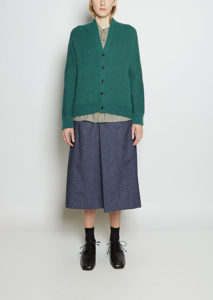 Stephan Schneider green cardigan with dolman sleeves in a wool and mohair knit. Rib trim at sleeve cuffs and hem. Tonal placket with contrast black button closure. Features signature seam detail at shoulder and along outer sleeves. Relaxed fit.