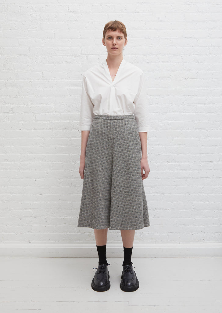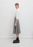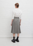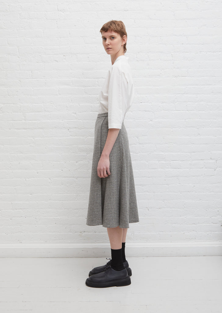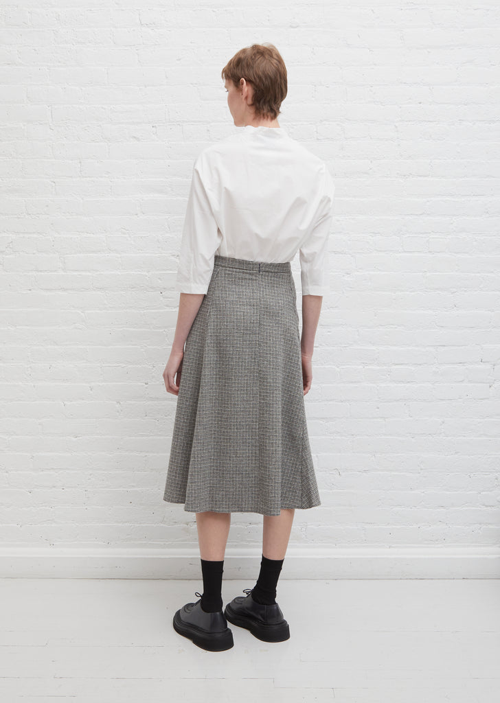Stephan Schneider A-line skirt in taupe and grey tone micro check wool. Features a flat front waist with a clean self waistband. Center back zipper closure. Concealed side pockets under front pleats. Fully lined.