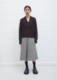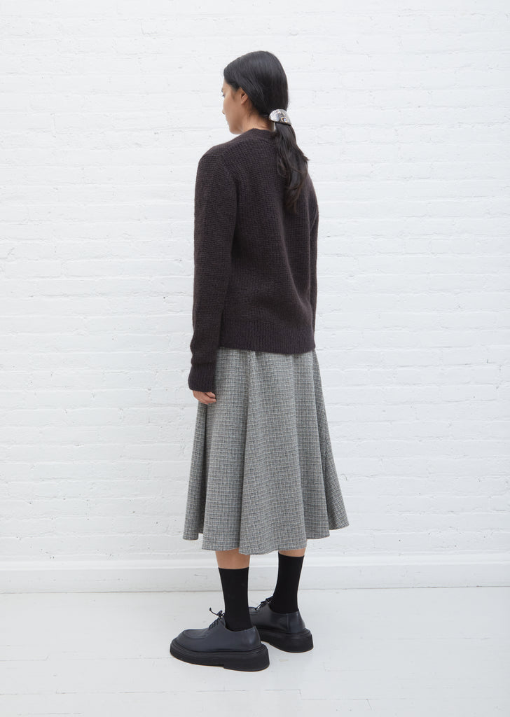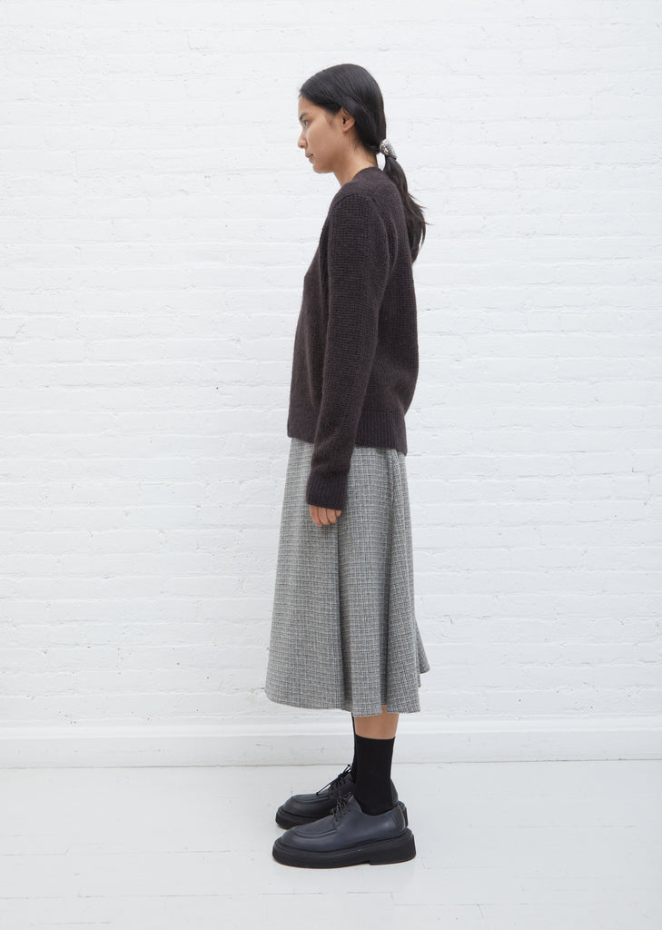 Stephan Schneider espresso brown melange V-neck sweater in mohair and wool blend knit. Detailed with signature overlap at center neckline, and rib trim finish at sleeves cuffs and hem. Straight cut with a relaxed fit.