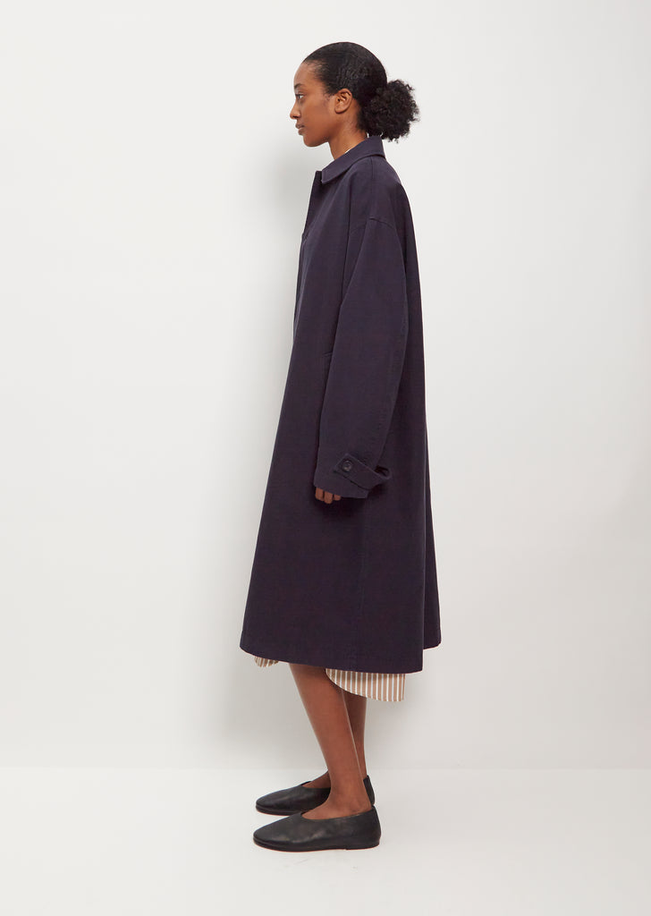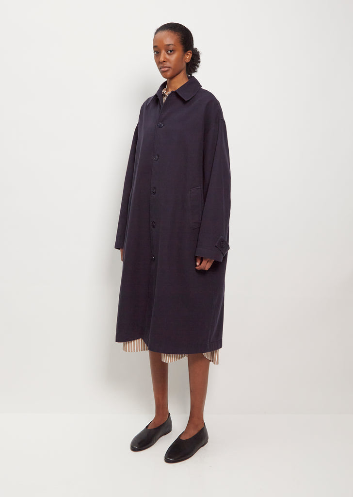 6397 dark navy single breasted trench coat in cotton gabardine. Features a spread collar, raglan sleeves, and welt side pockets. Lined.