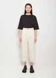 Adnym Atelier unisex off-white cropped, wide leg trouser with small front pleat in lightly textured cotton linen. Features black contrast top stitching, angled side pockets, back patch pockets, and concealed zip with button closure. Relaxed fit.
