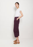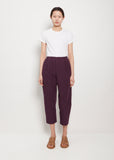 Apuntob aubergine trouser with a cropped, tapered leg in linen cotton. Features an elasticized waist and concealed side seam pockets. Unlined. Pulls on.