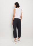 Apuntob dark trouser with a cropped, tapered leg in linen blend crepe. Features an elasticized waist and concealed side seam pockets. Unlined. Pulls on.