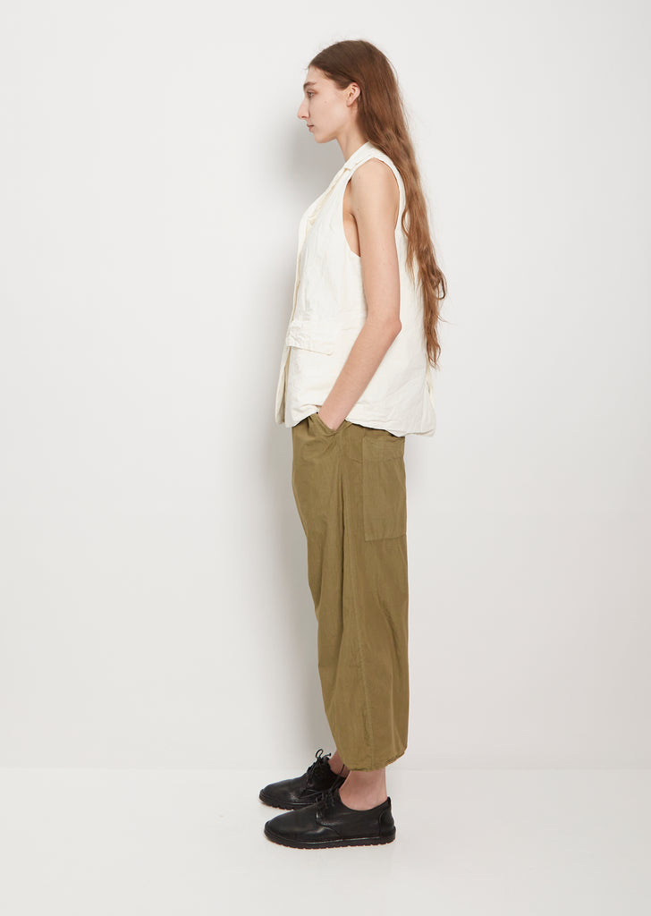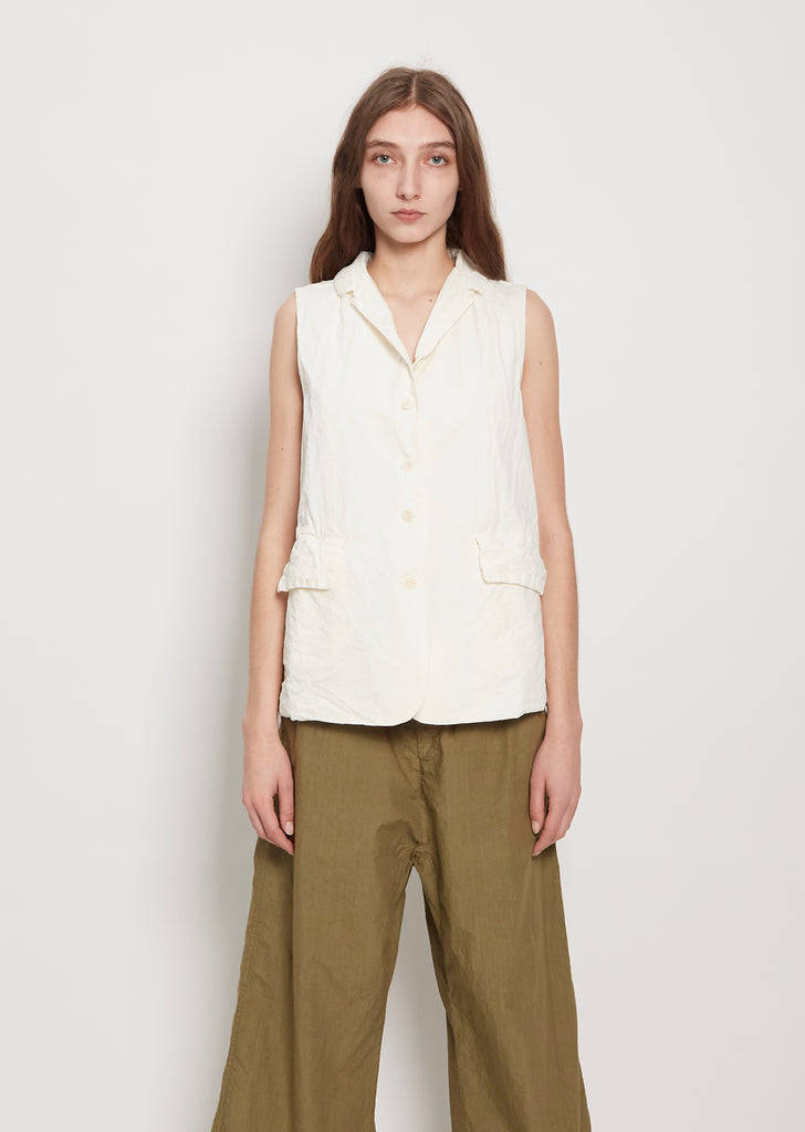 Album di Famiglia milk waistcoat with small notch collar in a heavyweight crushed cotton. Features front patch pockets, dropped shoulders, and a tonal button front closure. Back vent. Unlined. Relaxed, a-line silhouette.