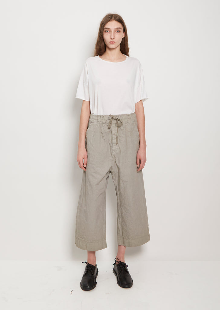 Album di Famiglia stone grey wide leg cropped trousers with an elasticated waist and self drawcords at front in washed cotton canvas. Slightly dropped crotch. Slash pockets at sides.