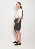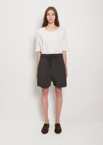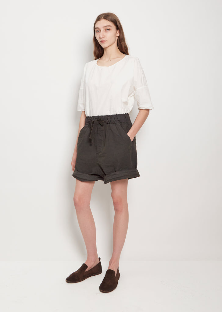 Album di Famiglia milk signature pull-on shorts with a wide elasticized waist and double patch pockets at back in a washed crisp cotton poplin. Features a tonal front drawstring and angled side pockets lined in self.