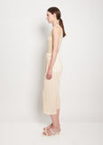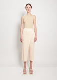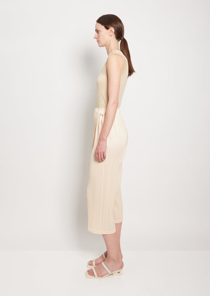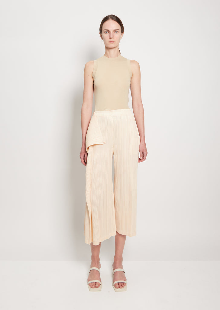 Pleats Please light beige cropped wide leg pants with wrap front in pleated technical chiffon. The panel can be tied in the front, back or left for soft drape. Elasticated waist. Side seam pockets. Pulls on.