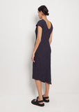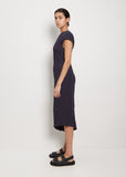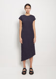 Blue Blue Japan dark navy bias cut dress with an asymmetric hem in crepe woven to create an undulating water surface texture. Features a round neck, scoop back, cap sleeves, gathering on the side, and invisible back zip closure.