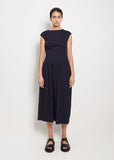 Blue Blue Japan indigo dress with a drop waist and gathered skirt in cotton slub knit. Features a wide neck, side seam pockets, and darts on bodice for a neat look.