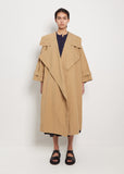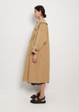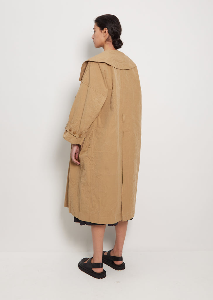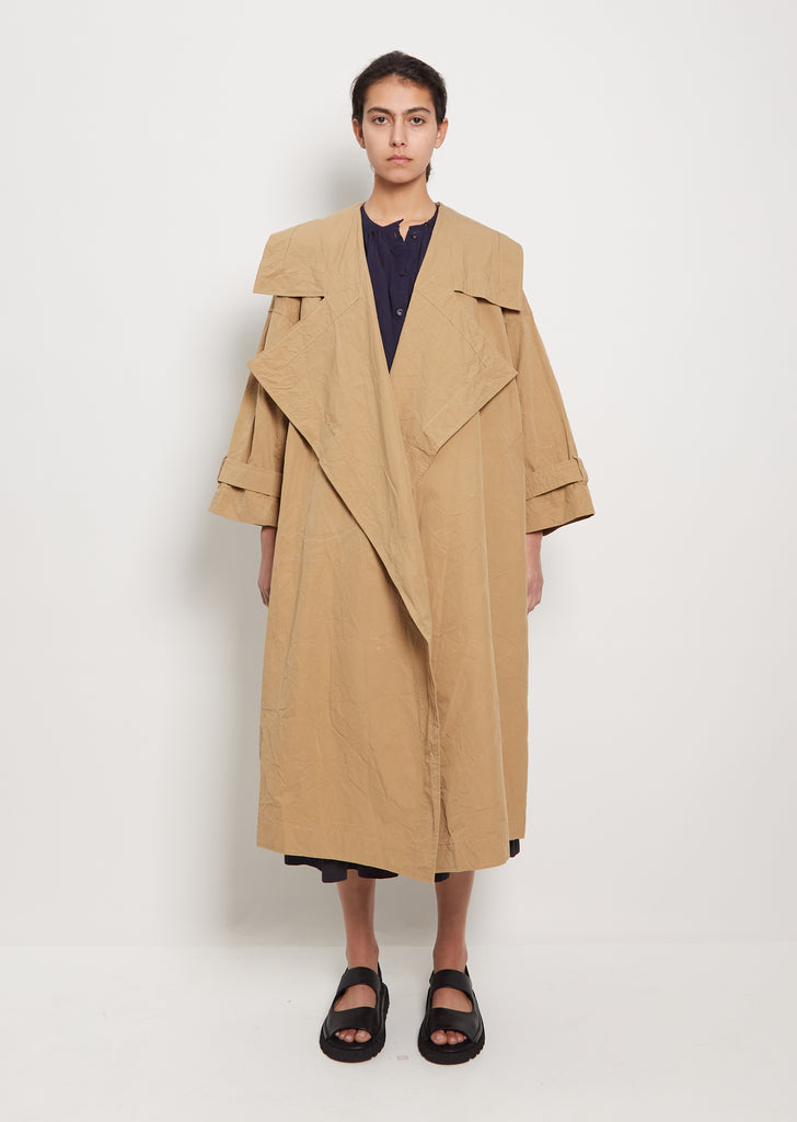Casey Casey camel trench coat with wide notched lapels and cropped, wide sleeves in card cotton with a washed finish. Features adjustable belted sleeve cuffs and angled side pockets. Self belt closure which can be removed. This coat is finished with corozo buttons and comes unlined.