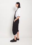 BLACK Comme des Garçons black cropped, tapered trousers with a bib front and adjustable halter neck in crepe. Features paneled details, adjustable waist side buckle, angled side pockets, one back flap welt pocket with single button, and one welt back pocket. Finished with white contrast hem and raw edge detailing.