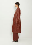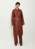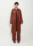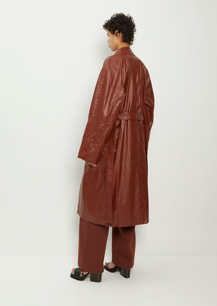 Lemaire signature trench coat in coated cotton. Features removable and adjustable belt, classic Lemaire raglan sleeves, and a concealed button front closure. Side pockets. High back vent. Unlined. Relaxed fit.