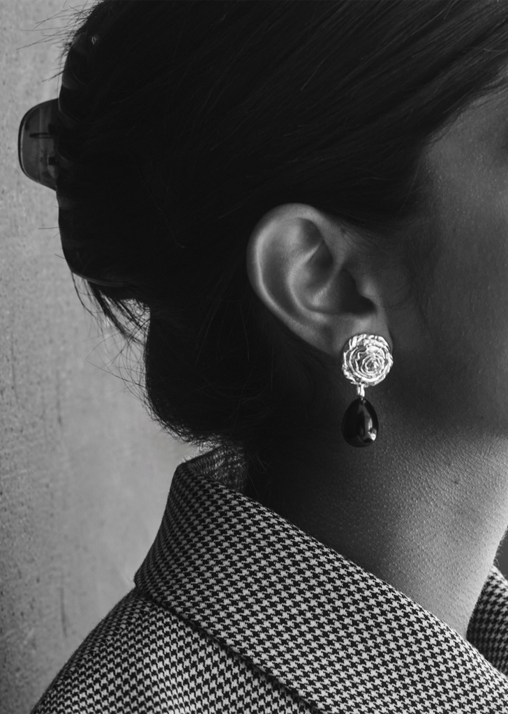 Corali disk earrings in the shape of a rose with onyx stones in sterling silver handcrafted in Copenhagen. Butterfly stud closure.