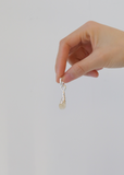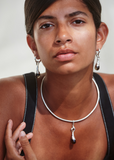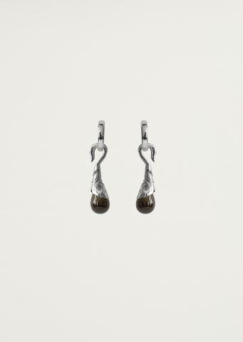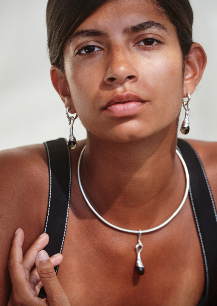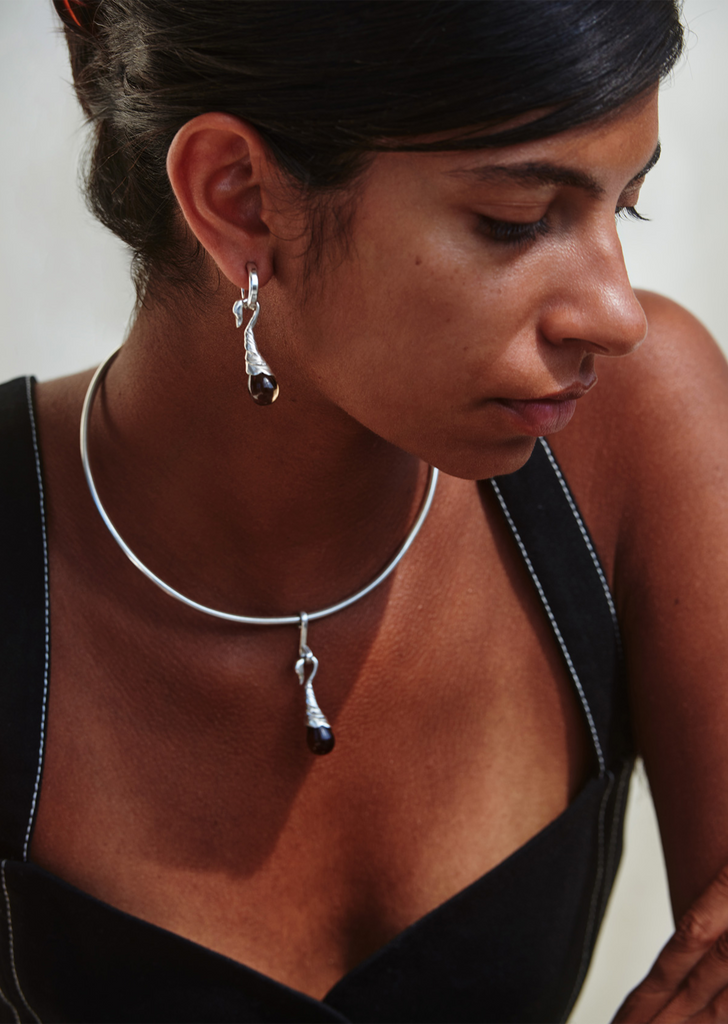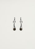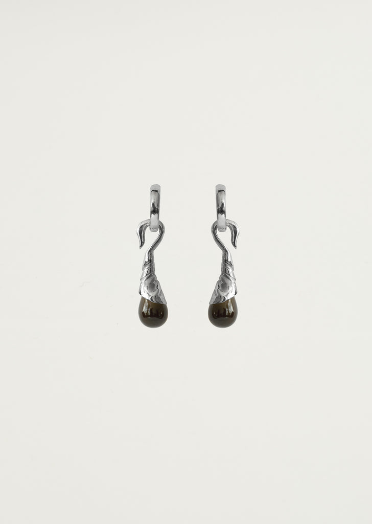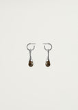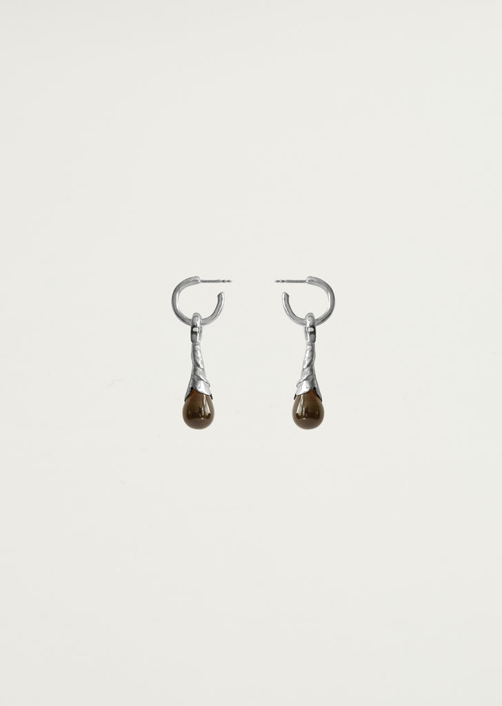 Corali hoop earrings with quartz stone pendants in sterling silver handcrafted in Copenhagen. Butterfly stud closure. Quartz stone changes appearance to a darker tone when worn on body.