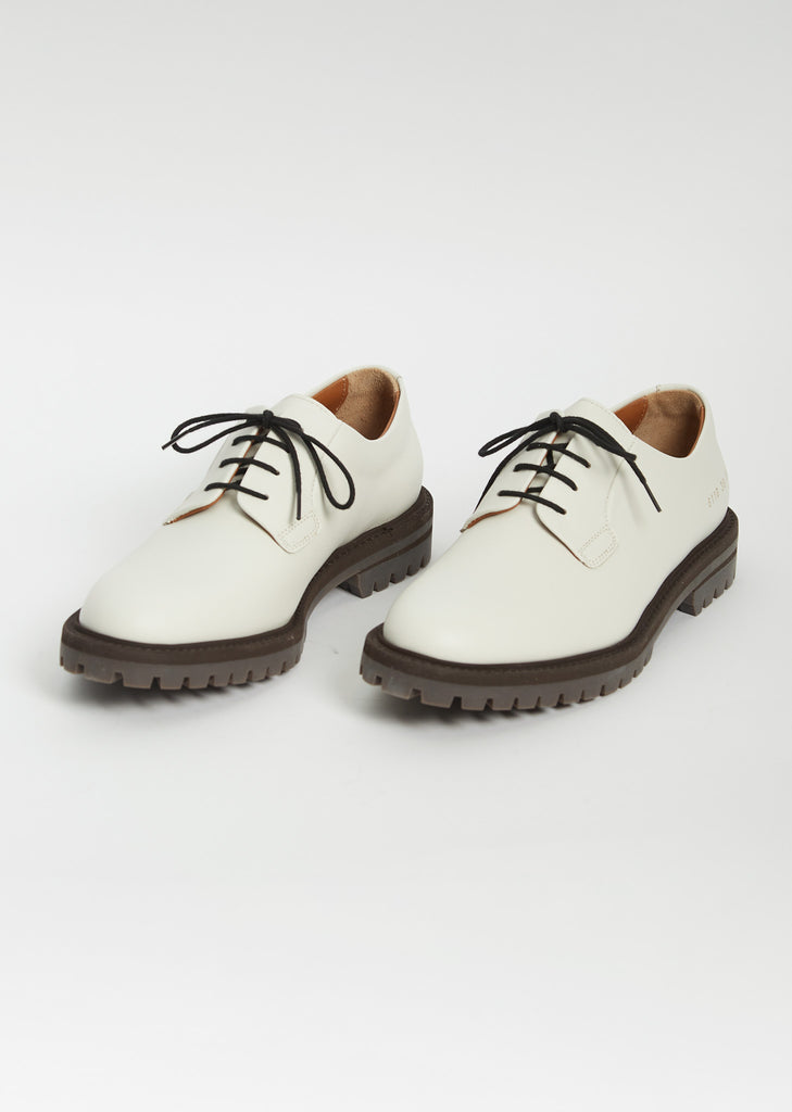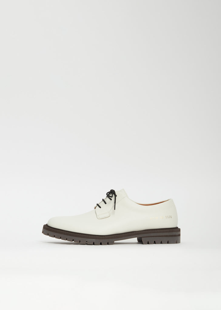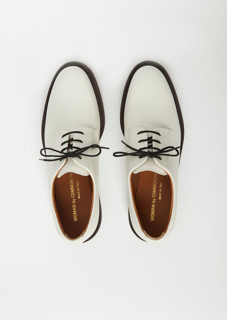 Common Projects white smooth leather low-top derby with an almond toe. Fully lined in contrast tan leather and black treaded foam rubber outsole. Signature gold stamped style numbers on side heel. 4-eyelet lace-up construction with contrast black laces.