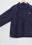Danton black hip length workwear style jacket in cotton denim. Features a spread collar, hip patch pockets, chest patch pocket, button cuffs, and button front closure. Straight fit.