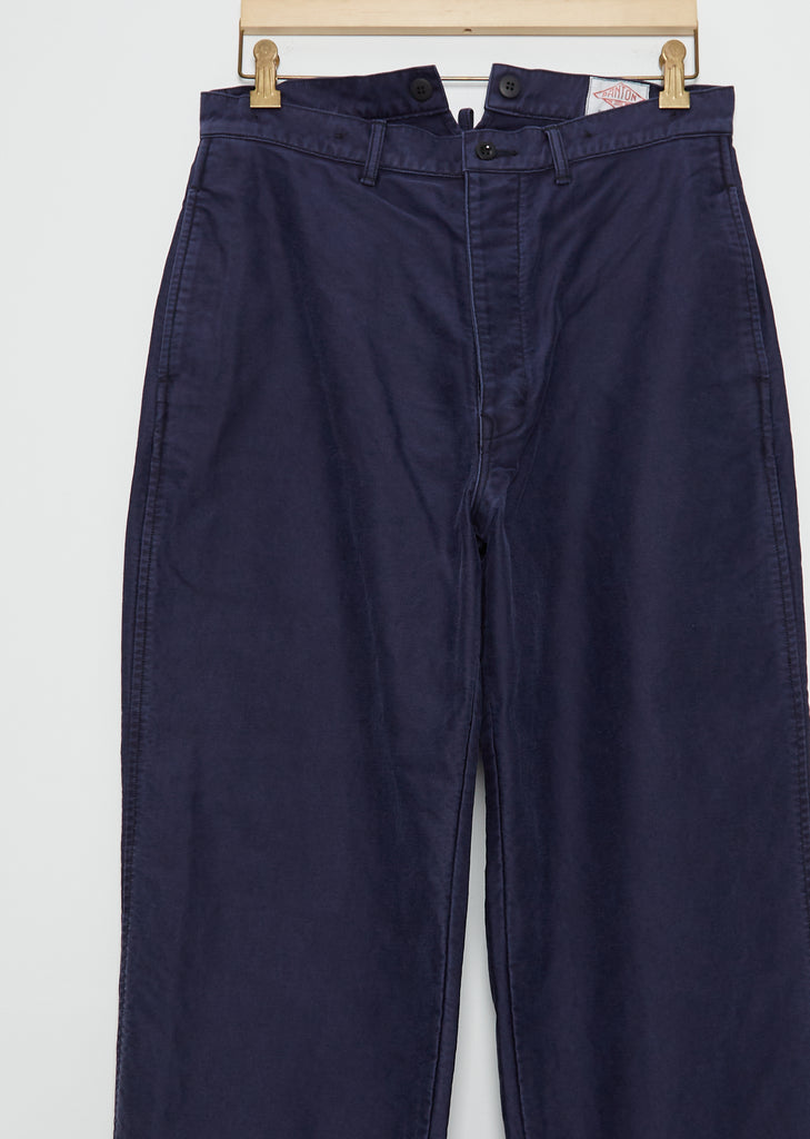 Danton navy wide leg pant with a high rise fit in Japanese cotton twill with a vintage-like wash. Features a buckle back, inner suspender buttons, side slip pockets, single back patch pocket and a concealed zip with button closure.
