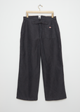 Danton black wide leg pant with a high rise fit in Japanese cotton twill with a vintage-like wash. Features a buckle back, inner suspender buttons, side slip pockets, single back patch pocket and a concealed zip with button closure.