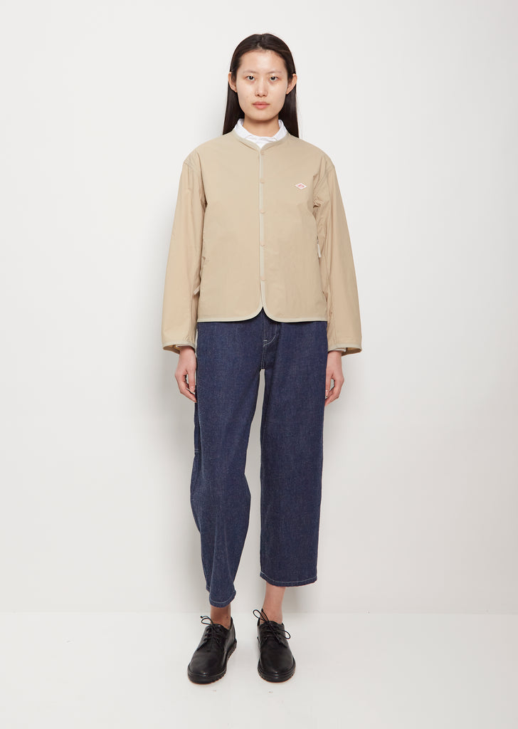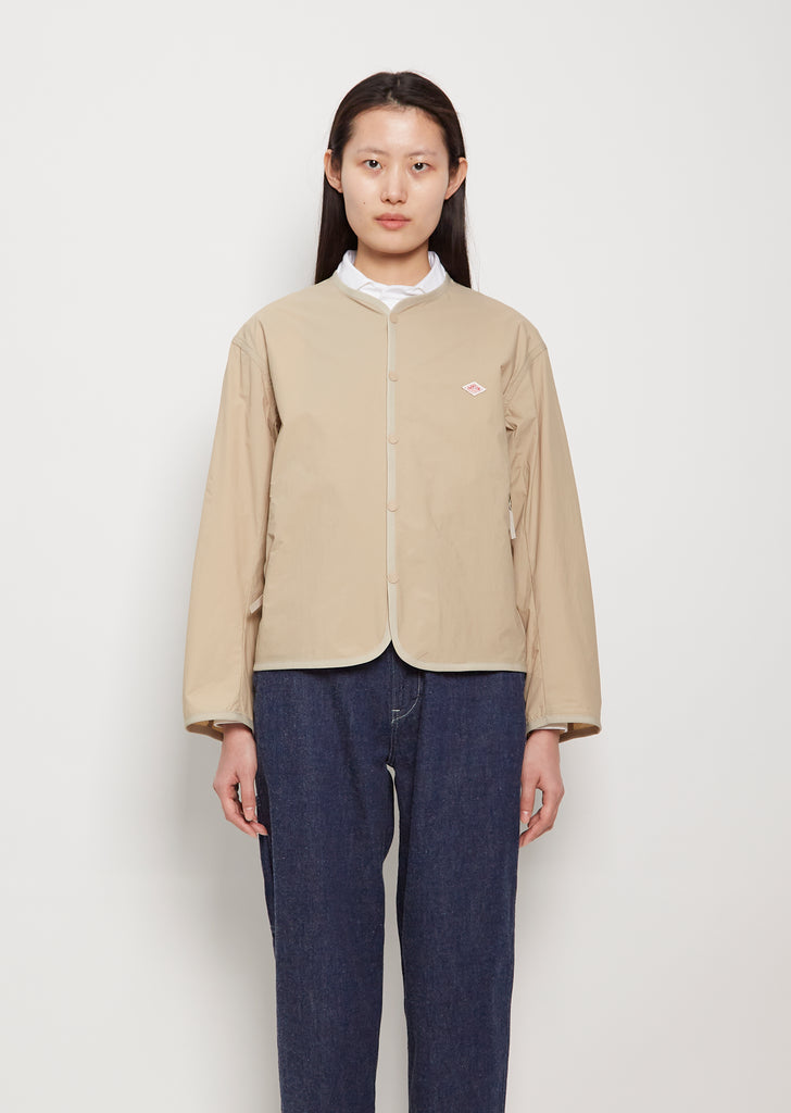 Danton beige collarless shell jacket in nylon. Features a tonal snap front closure and angled zip pockets. Boxy fit.