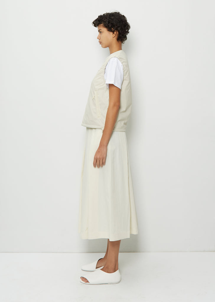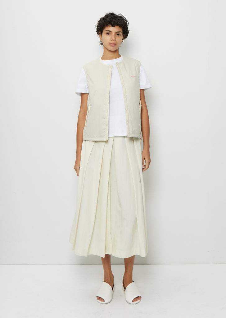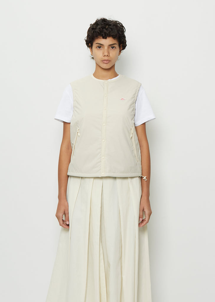 Danton ivory padded vest in. Features tonal snap front closure, angled zip pockets, and drawcords at hem to adjust fit. Boxy fit.